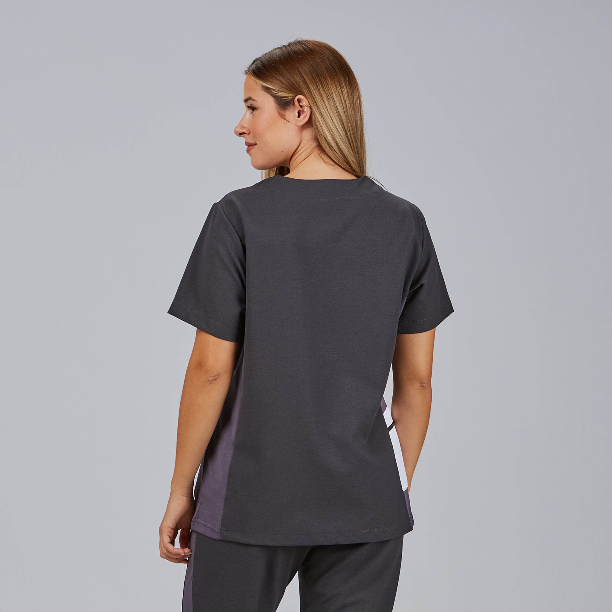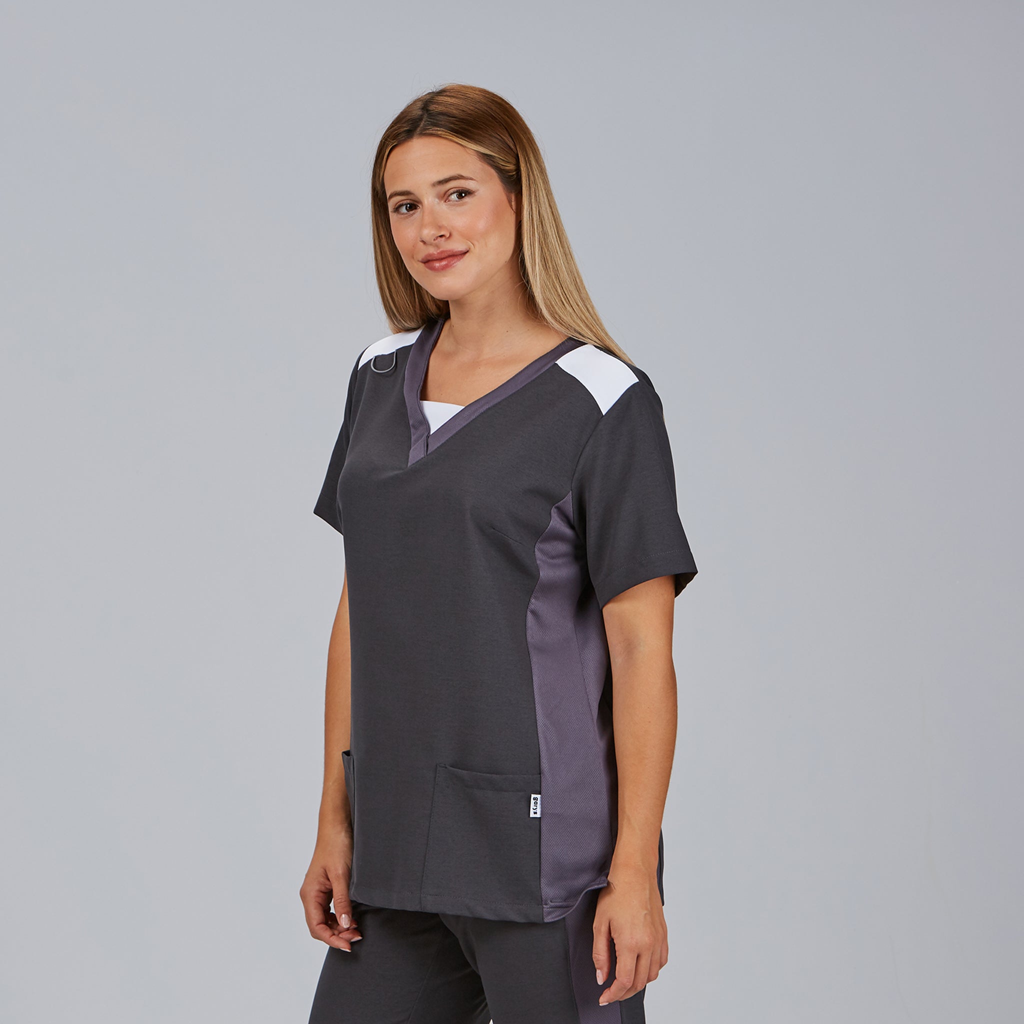 Discover the innovative LETICIA WOMEN'S BLOUSE, designed for healthcare professionals seeking comfort and style. This short-sleeved blouse is made from 360 VIGORÉ MICROFIBRE 95% PES 5% EA - 170 g/m², which offers exceptional elasticity in all directions, providing freedom of movement and unparalleled comfort. Its marbled fabric combines fibres of various colours, giving it a modern and attractive look. The semi-fitted garment features AEROSILVER technical fabric details on the side panels and collar, adding a touch of sophistication. With a V-neck, two front pockets and a zipped pocket on the right side panel, this blouse has side slits and side panels at the front and back. Available colours: Pearl grey (C/117) | Charcoal grey (C/139) Matching trousers: 704600. Men's version: 617800. Discover the perfect combination of style and functionality with the LETICIA BLOUSE!