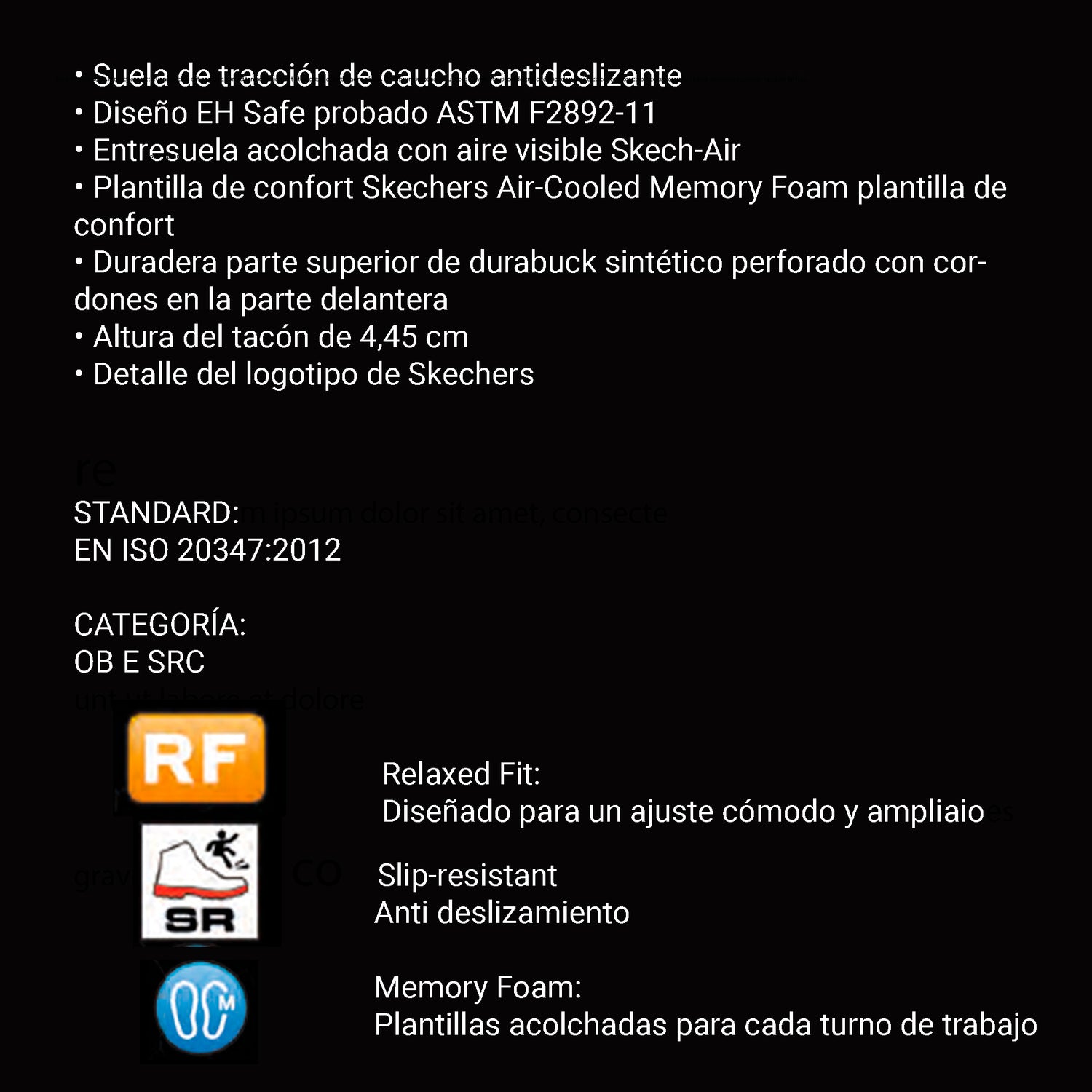 Confort, style and safety combine easily in Skechers Work Relaxed Fit: Uno SR-Sutal. This lace-up work design features a smooth perforated synthetic upper with an Air-Cooled Memory Foam insole and a visible Skech-Air air-cushioned midsole. • Electrical Hazard (EH) Safe design. • EH Safe design tested ASTM F2892-11 • Slip-resistant traction outsole with oil resistance. • Skechers Air-Cooled Memory Foam comfort insole. • Skech-Air visible air-cushioned midsole. • Relaxed Fit system for a roomy fit at toe and forefoot. • Smooth synthetic 'durabuck' perforated upper with lace-up front. • 1 3/4 inch heel height. • Skechers logo detail. • Hand washed. STANDARD : EN ISO 20347 : 2012 CATEGORY : OB E SR