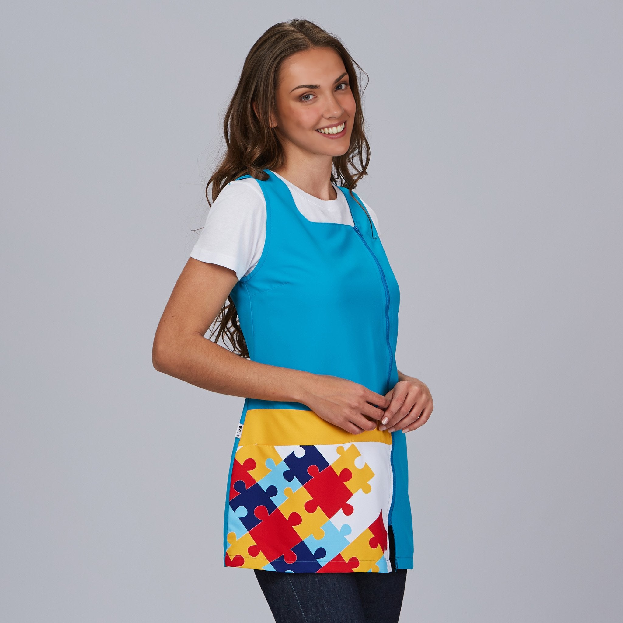 Questa camicetta presenta una stampa speciale dedicata al disturbo dello spettro autistico (ASD). Il disegno mira a sensibilizzare e a promuovere la comprensione e l'accettazione dell'ASD nella società. È un bel modo per mostrare sostegno e solidarietà alla comunità autistica. La camicetta è realizzata in microfibra antibatterica, 100% poliestere. Questo materiale è noto per la sua morbidezza, leggerezza e resistenza alla crescita batterica, che lo rendono una scelta igienica per l'ambiente scolastico e clinico. Tessuto resistente agli schizzi di candeggina diluita in acqua. Il design senza maniche offre comfort e libertà di movimento, essenziali per i professionisti che lavorano a lungo con bambini e adulti dello spettro autistico. Il top si chiude facilmente con una zip frontale. Questo facilita la vestizione e la svestizione, importante in situazioni in cui sono necessarie rapidità e facilità. Le pinces sui fianchi e sulla schiena assicurano una vestibilità comoda e confortevole. Inoltre, contribuiscono all'aspetto professionale del capo. La camicetta è dotata di una tasca interna sul lato destro. Questa tasca è pratica per trasportare piccoli oggetti o utensili essenziali, come penne o dispositivi di comunicazione, in modo sicuro e discreto. Questa camicetta è stata pensata per i professionisti dell'educazione, come insegnanti ed educatori, nonché per gli assistenti che lavorano negli asili e nei centri specializzati.