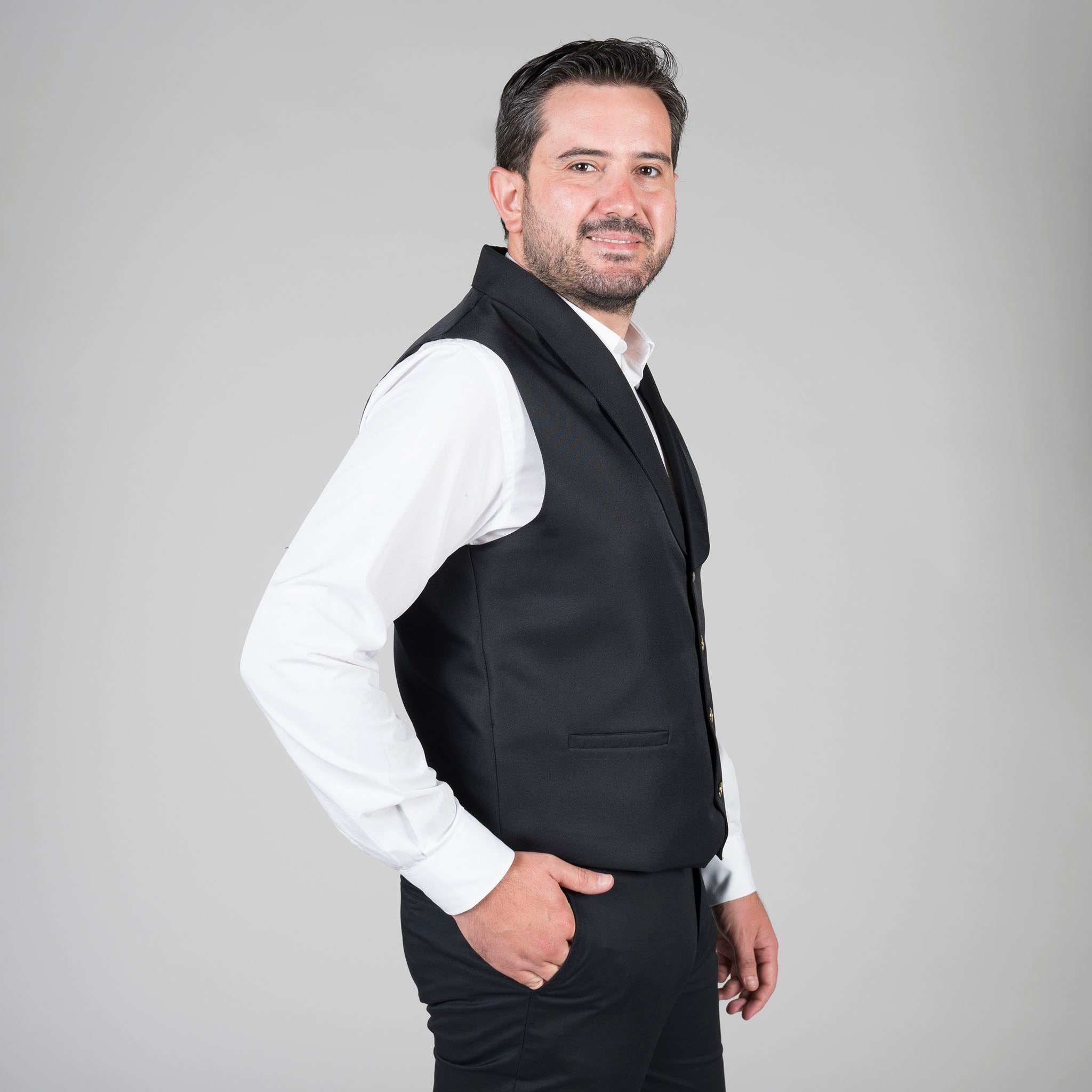 Il gilet da cameriere con collo a fumo in nero si distingue per il suo stile sofisticato. Il colletto a giacca e i bottoni a losanga color oro aggiungono un tocco di eleganza e distinzione al capo, assicurando al personale un aspetto curato e professionale. Dotato di due tasche a filetto, questo gilet consente ai camerieri di portare con sé piccoli oggetti essenziali come penne, blocchi per appunti o biglietti da visita, utili in un ambiente di ospitalità. Il taglio semi-aderente di questo gilet è stato accuratamente studiato per garantire una vestibilità impeccabile. Il gilet si appoggia comodamente al corpo, consentendo una libertà di movimento ottimale durante il lavoro. Realizzato in 100% poliestere SARGA, questo gilet è robusto e durevole, in grado di resistere alle esigenze dell'ambiente alberghiero. Oltre alla sua eleganza, è un capo di qualità che resiste alla prova del tempo. Questo gilet è una scelta versatile che si adatta a diversi ambienti dell'ospitalità, da ristoranti e bar a hotel e pub. Si combina facilmente con altri indumenti dell'uniforme, rendendolo perfetto per il personale di tutti i tipi di strutture ricettive. Il gilet da cameriere con collo a fumo, di colore nero, non punta solo sulla moda, ma anche sulla funzionalità e sul comfort, essenziali nell'ambiente dell'ospitalità. Disponibile anche in versione femminile, referenza 998000.
