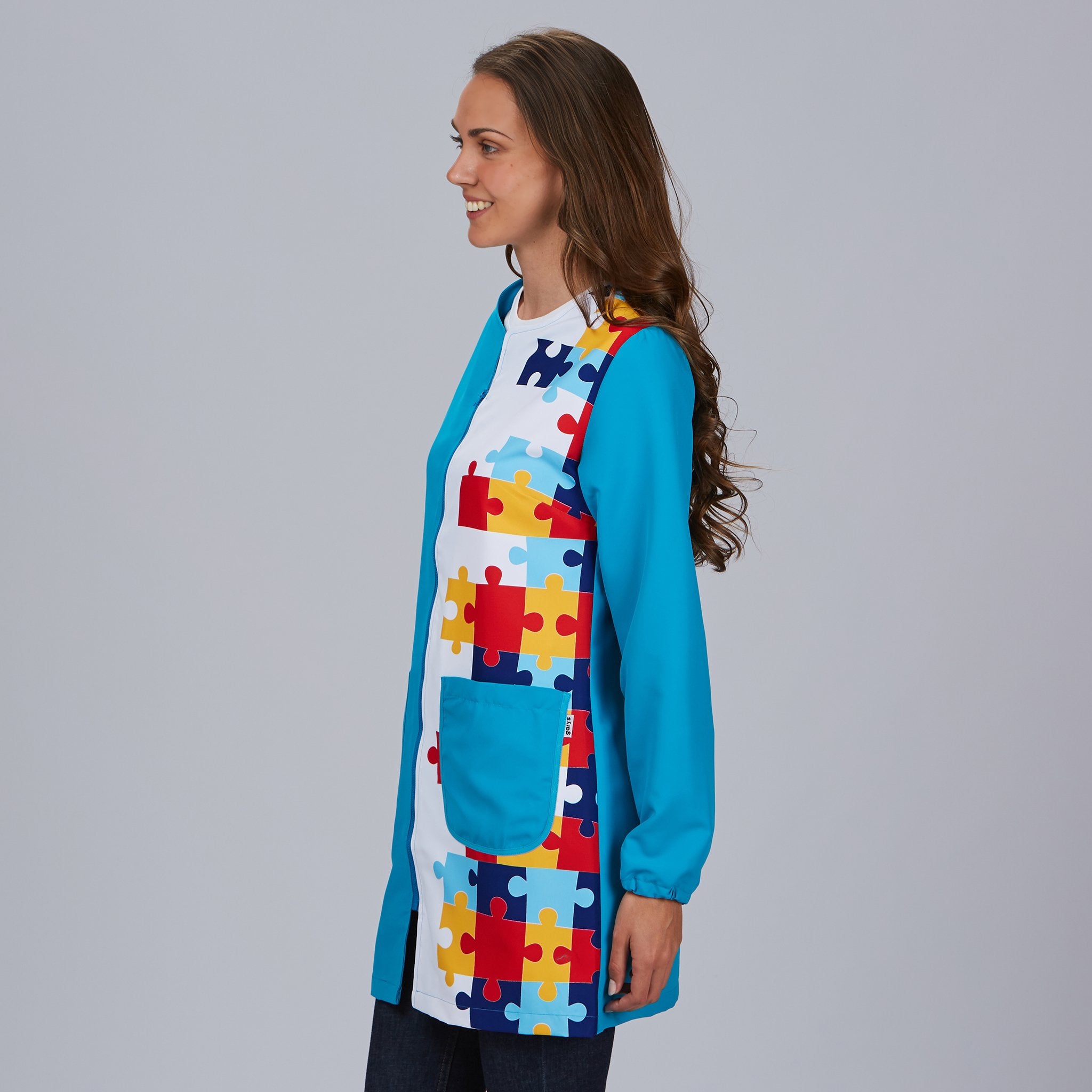 El estampado en esta bata está dedicado al Trastorno del Espectro Autista, lo que la convierte en una prenda que muestra apoyo y conciencia hacia esta causa importante. Esto puede ser especialmente relevante en entornos educativos y de atención al público, donde se valora la sensibilidad hacia las necesidades de las personas con TEA y sus familias.