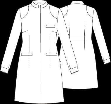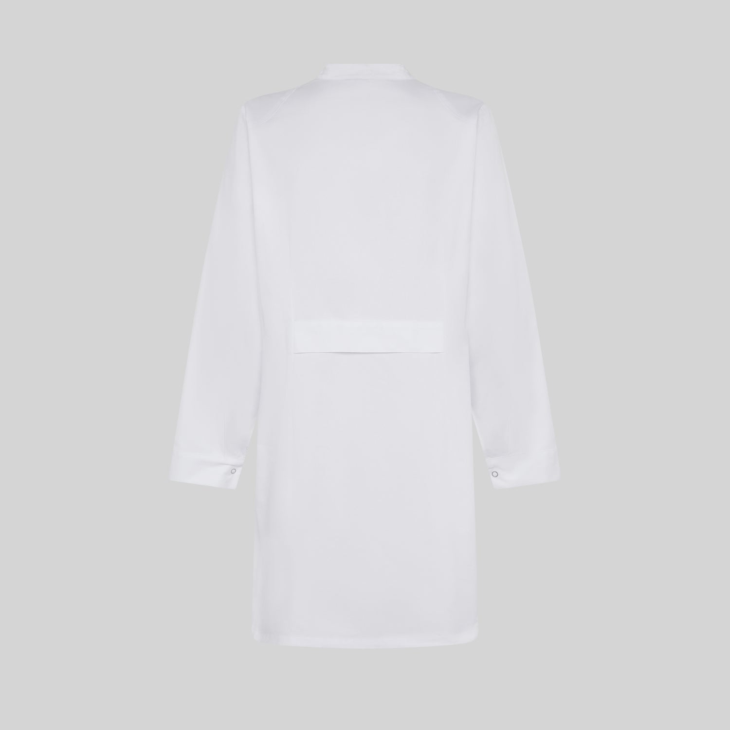 Confeccionada en SARGA 65% PES 35% CO - 200 gr/m², esta bata de manga larga presenta un corte femenino con puños con corchetes, cuello mao y cierre mediante botones de presión ocultos.