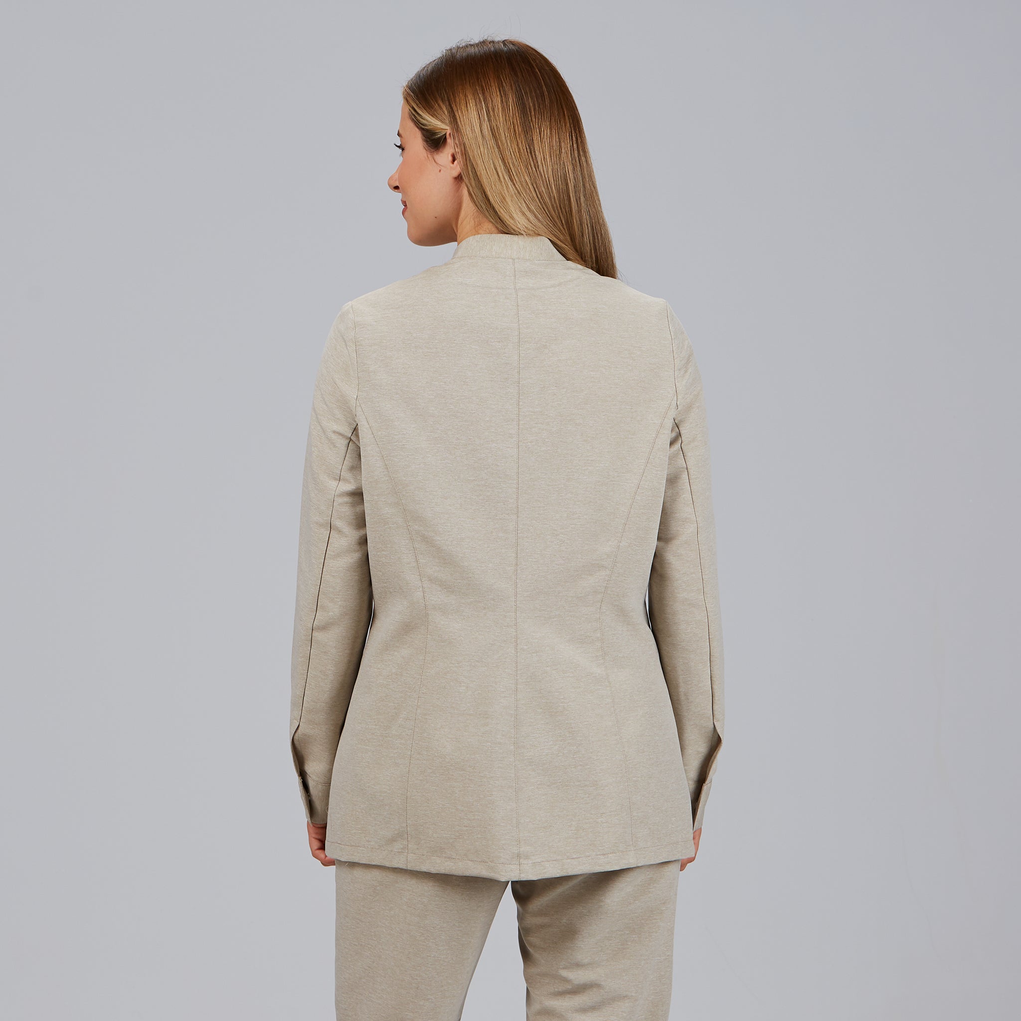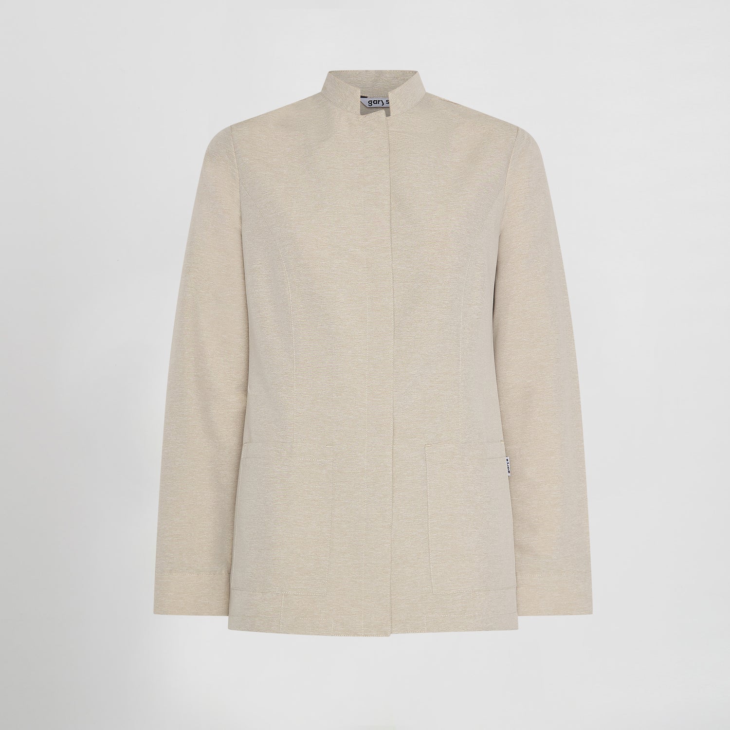 La blusa Gaia destaca por su diseño limpio y profesional, ideal para quienes buscan una imagen cuidada sin renunciar a la comodidad. Su cuello mao, combinado con manga larga y cierre central con botones de presión ocultos, aporta un estilo minimalista y funcional.