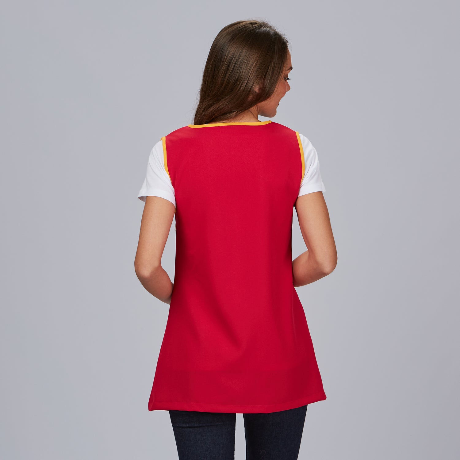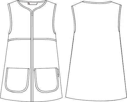 Incluye dos bolsillos delanteros prácticos, cada uno con bies de color combinado: uno en fucsia y otro en celeste, que aportan contraste y originalidad. La cremallera frontal central y el canesú delantero completan un diseño funcional, ideal para educación, comercio, atención al cliente o entornos creativos.