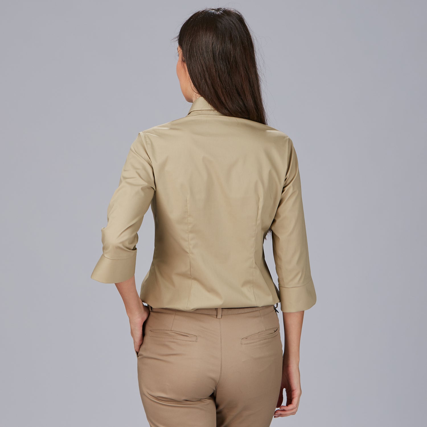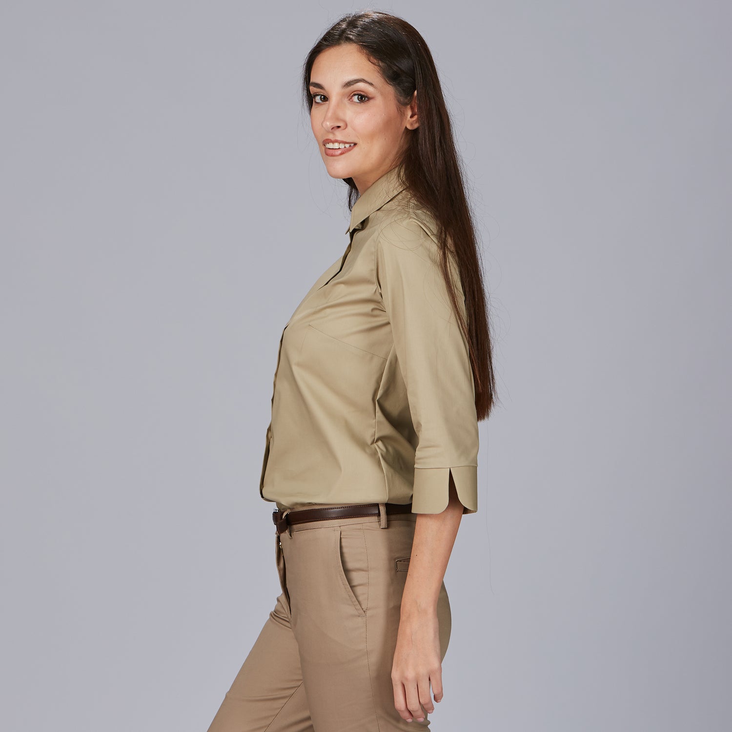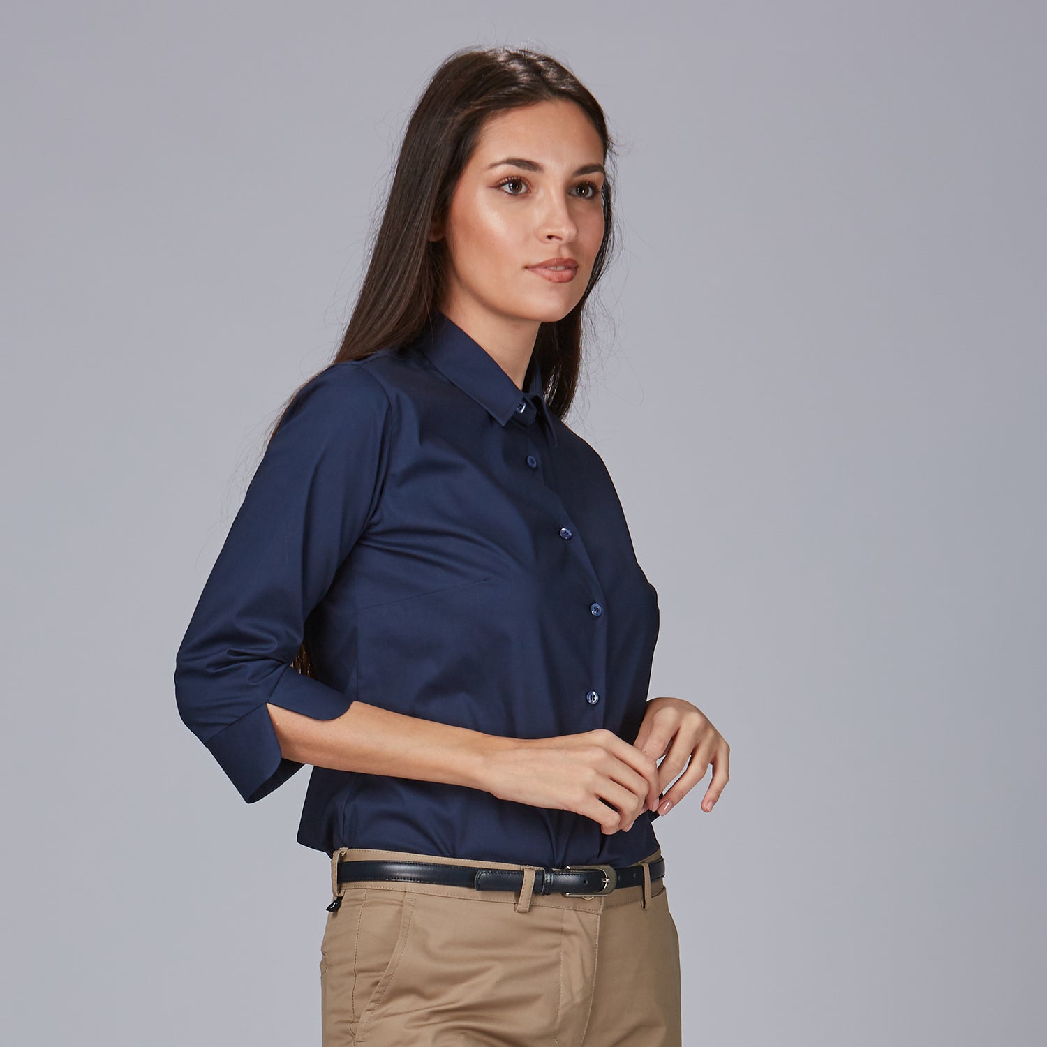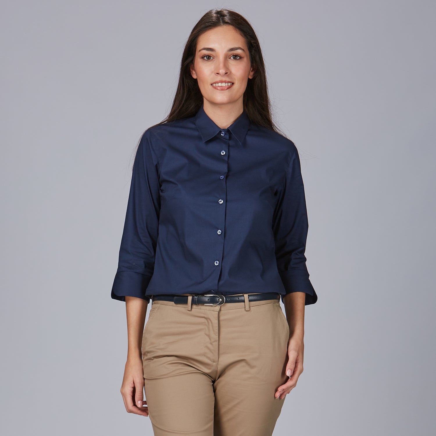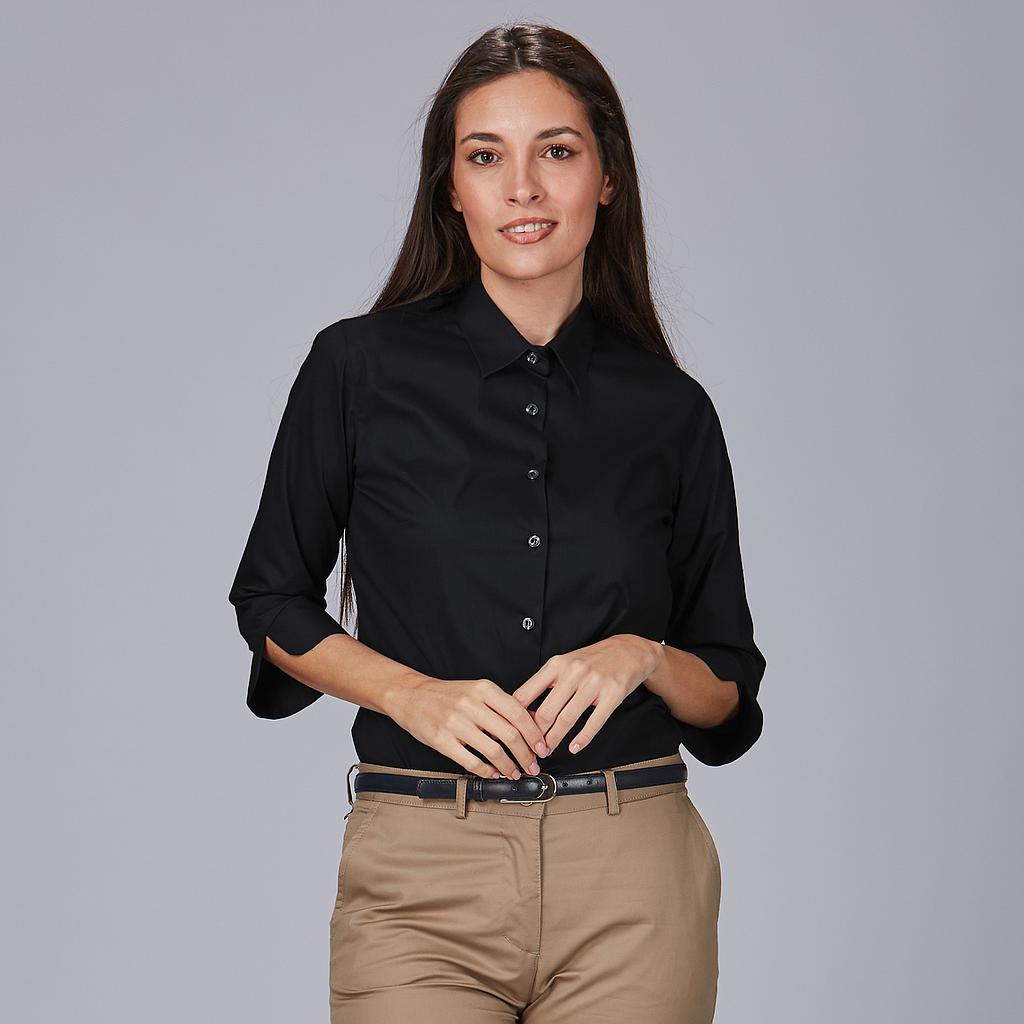 La camisa mujer 3/4 Beatrice es la elección perfecta para quienes buscan una prenda elegante y cómoda en su día a día laboral. Con un diseño holgado que proporciona libertad de movimiento, esta camisa destaca por su cuello camisero clásico y una manga 3/4 con puño abierto en V, que aporta un toque moderno y sofisticado. Su cierre delantero derecho sobre izquierdo y las pinzas en pecho y espalda garantizan una caída favorecedora y una silueta estilizada.