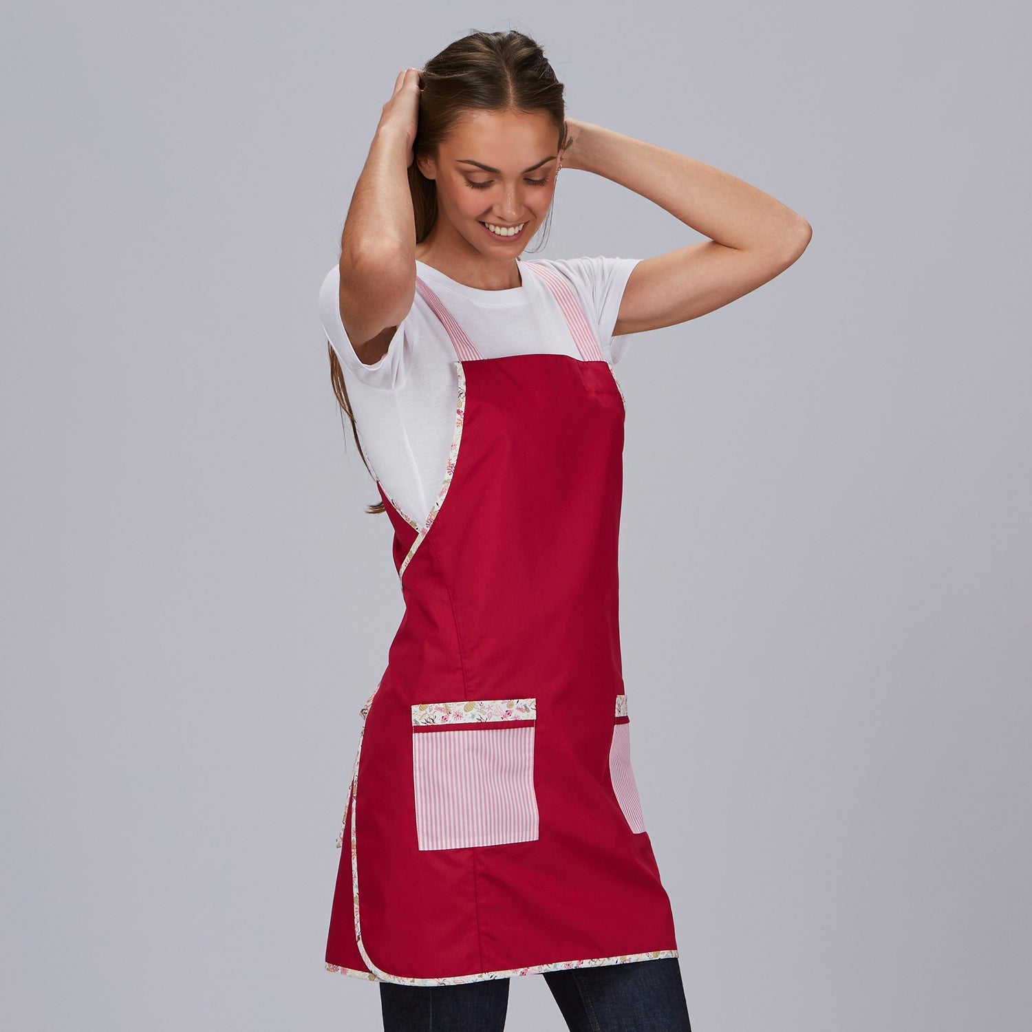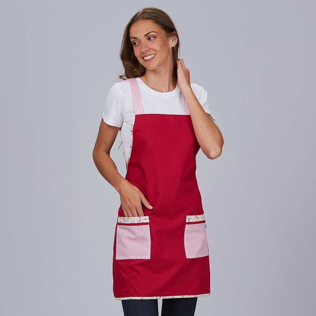 Confeccionada en tejido PLANA ligero y sostenible (43% poliéster, 32% poliéster reciclado, 25% algodón) de 132 g/m², es ideal para quienes valoran la moda laboral respetuosa con el entorno. Sus tirantes anchos en vichy rosa y las sisas ribeteadas con estampado Aquarium añaden un toque original y distintivo, ideal para sectores como educación, estética, comercio, hostelería o centros infantiles.