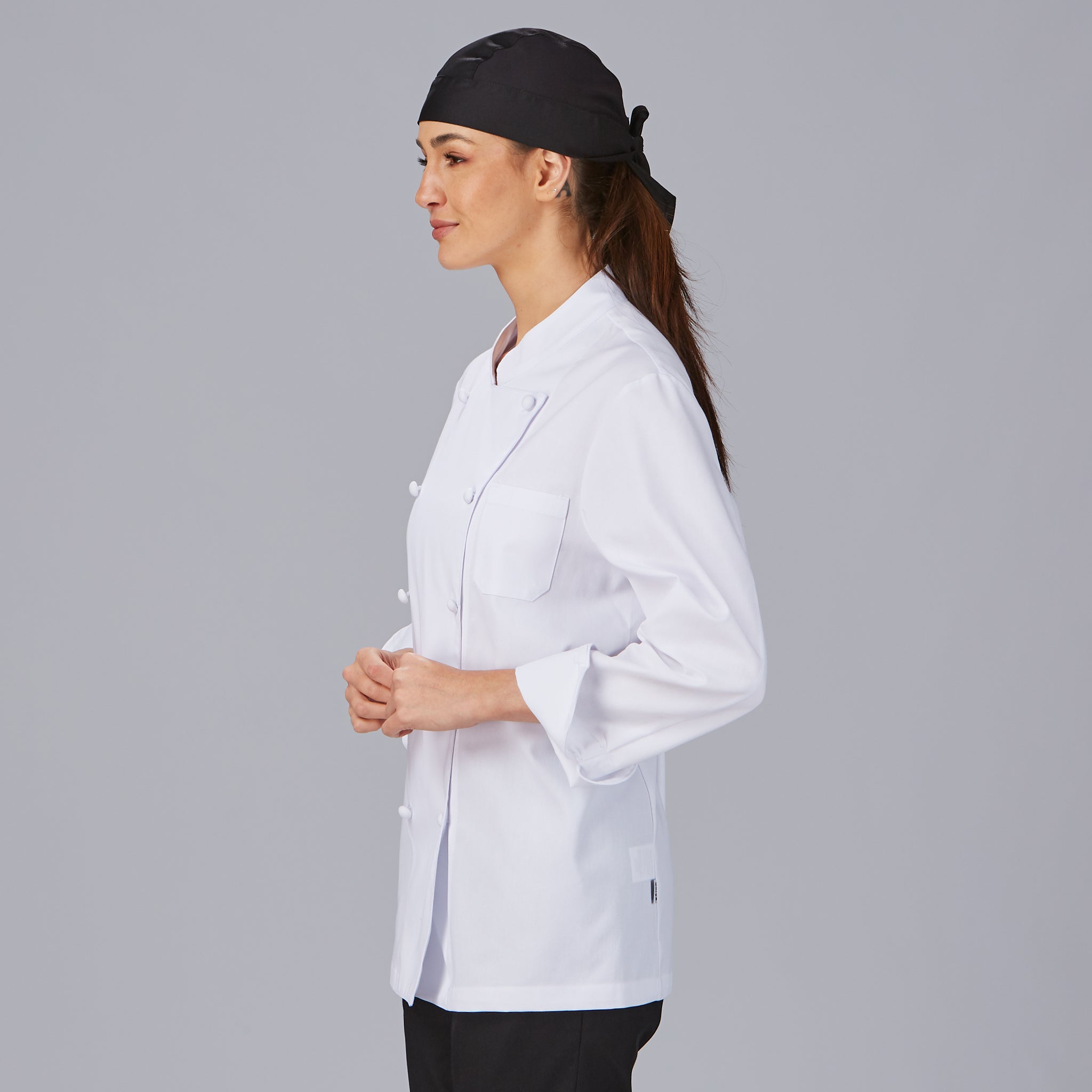 Las mangas largas con vuelta en los puños no sólo proporcionan protección adicional, sino que también añaden un toque de estilo a la chaqueta. Son ideales para protegerse de salpicaduras y derrames en la cocina.