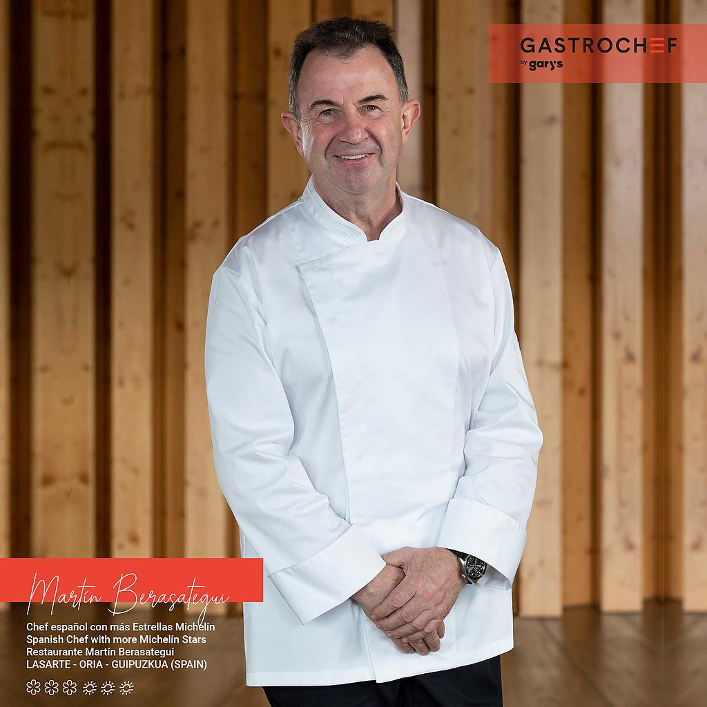 Chaqueta GASTROCHEF unisex, en manga larga, con cuello chimenea, cierre cruzado mediante botones de presión ocultos y bolsillo en manga izquierda. Modelo semi ajustado.