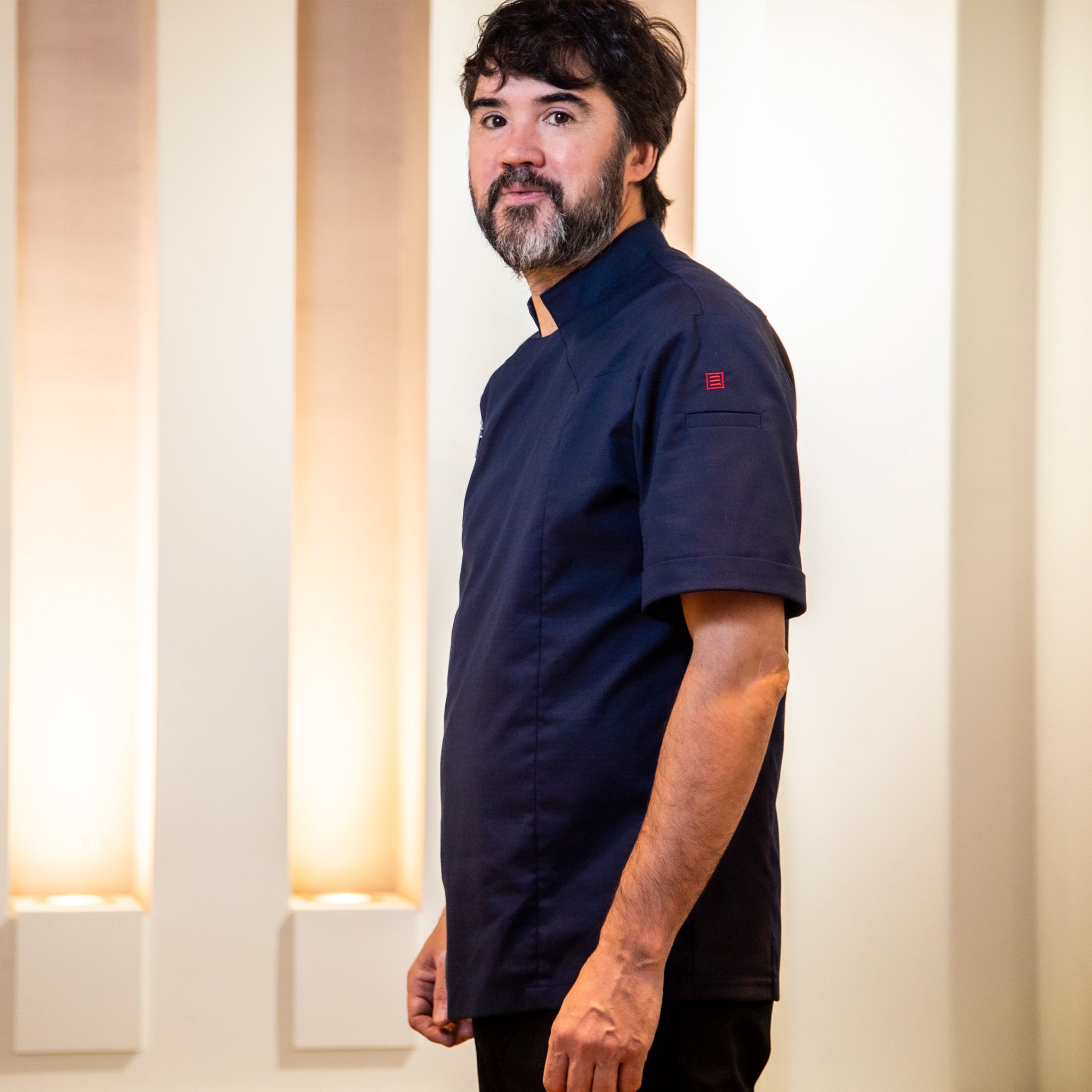 Chaqueta GASTROCHEF unisex en manga corta, con cuello mao, cierre lateral mediante cremallera y con bolsillo en manga izquierda. Modelo semi ajustado.