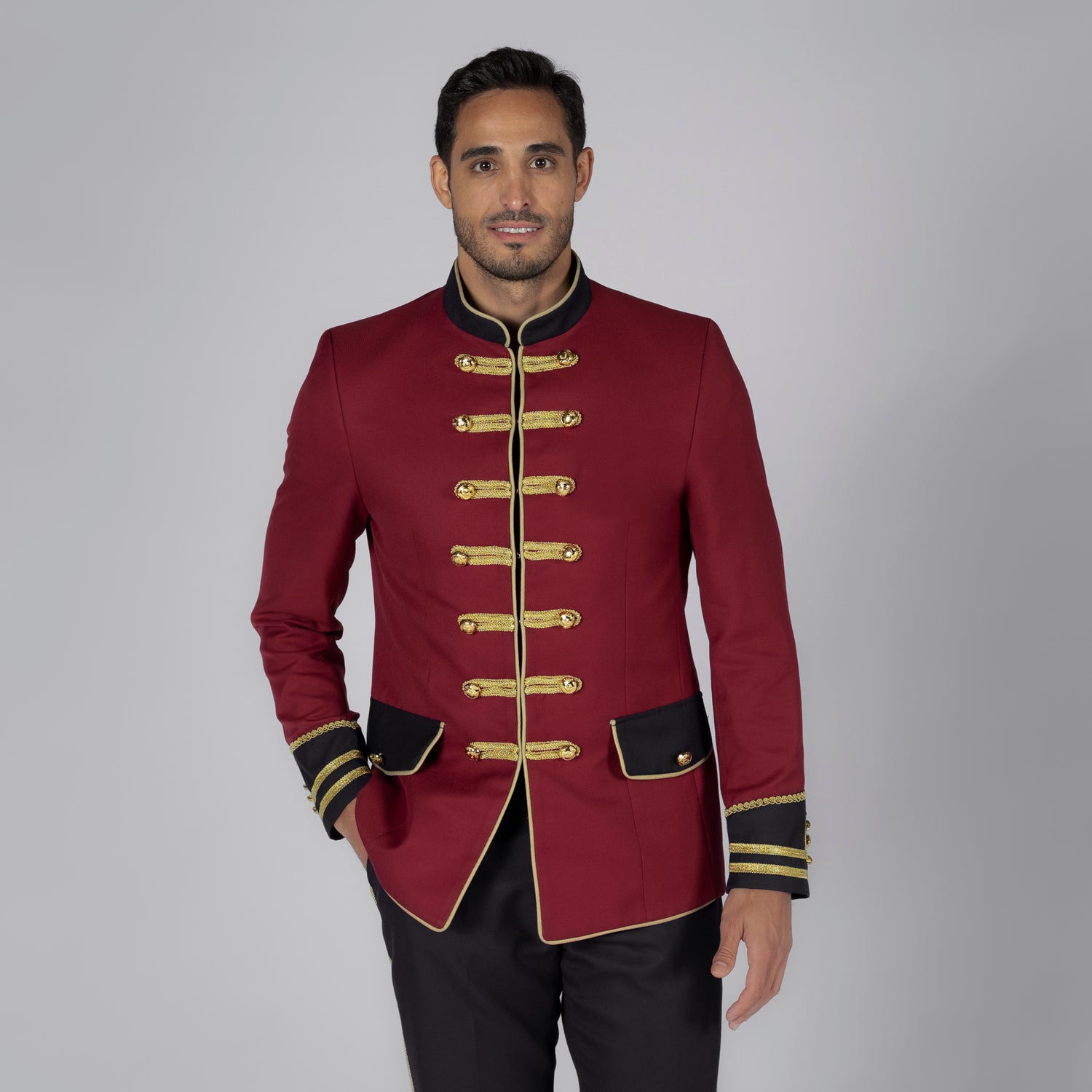 Eleva el estilo de tu banda con nuestra Chaqueta para Bandas de Música para hombres, una prenda diseñada para destacar en el escenario. Confeccionada en SARGA 65% POLIÉSTER Y 35% VISCOSA, esta chaqueta, disponible en elegante color burdeos, añade un toque de distinción a la imagen de los profesionales de las bandas de música. Realizada bajo pedido y forrada para mayor comodidad, esta chaqueta presenta un diseño único con 1 bolsillo en el interior del delantero derecho de 2 vivos, ofreciendo funcionalidad sin sacrificar estilo. Resalta la identidad y cohesión de tu banda con esta prenda exclusiva que combina calidad, elegancia y un toque moderno para destacar en cada actuación.