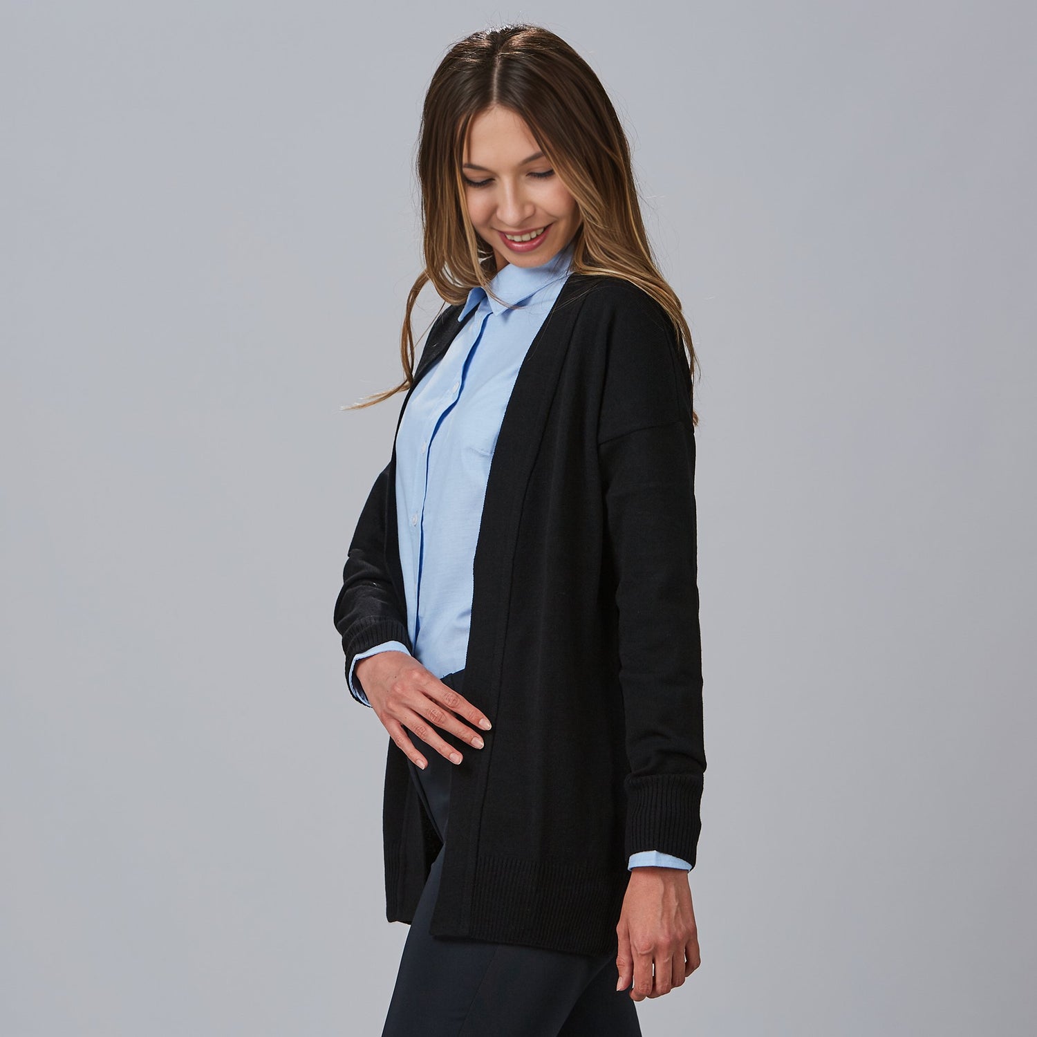 La ausencia de botones en esta rebeca simplifica su uso diario, lo que resulta especialmente útil en situaciones laborales donde se requiere movilidad y rapidez. Además, su corte semi ajustado brinda comodidad sin sacrificar el estilo.