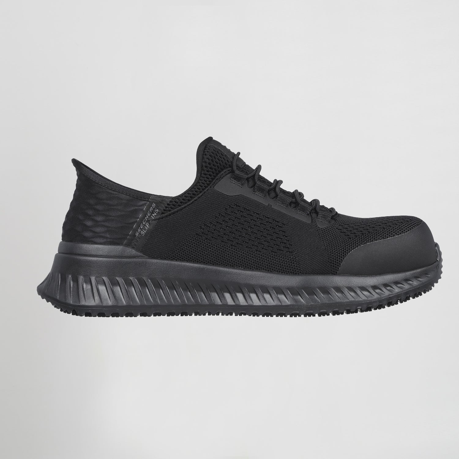 Este diseño slip-on de trabajo cuenta con una malla transpirable y parte superior sintética con un frente de cordón elástico, un panel de talón moldeado Skechers Slip-ins®, exclusivo Heel Pillow™, puntera de seguridad de composite, y una plantilla acolchada Air-Cooled Memory Foam®.